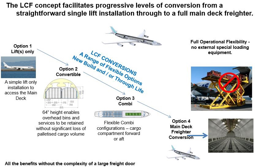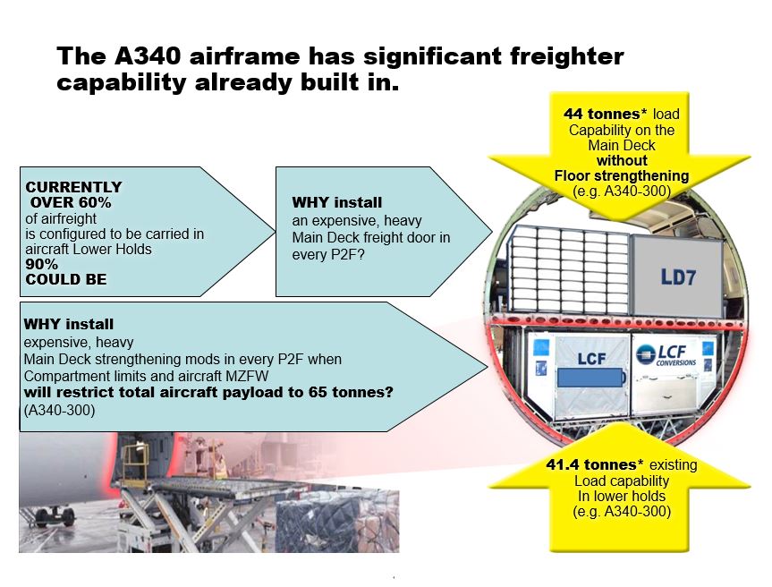 The LCF concept readily adapts the entire A340 family aircraft to offer freighter capability.
