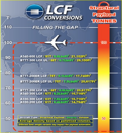 The table below illustrates the potential LCF widebody freighter conversion capabilities, specifically their respective gross payload and average density with a full payload. The LCF conversion retains the full range capability of the donor passenger variant and if required, the airframe can be converted to a combi or back to all-passenger configuration.