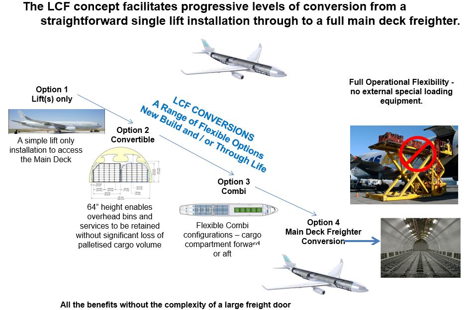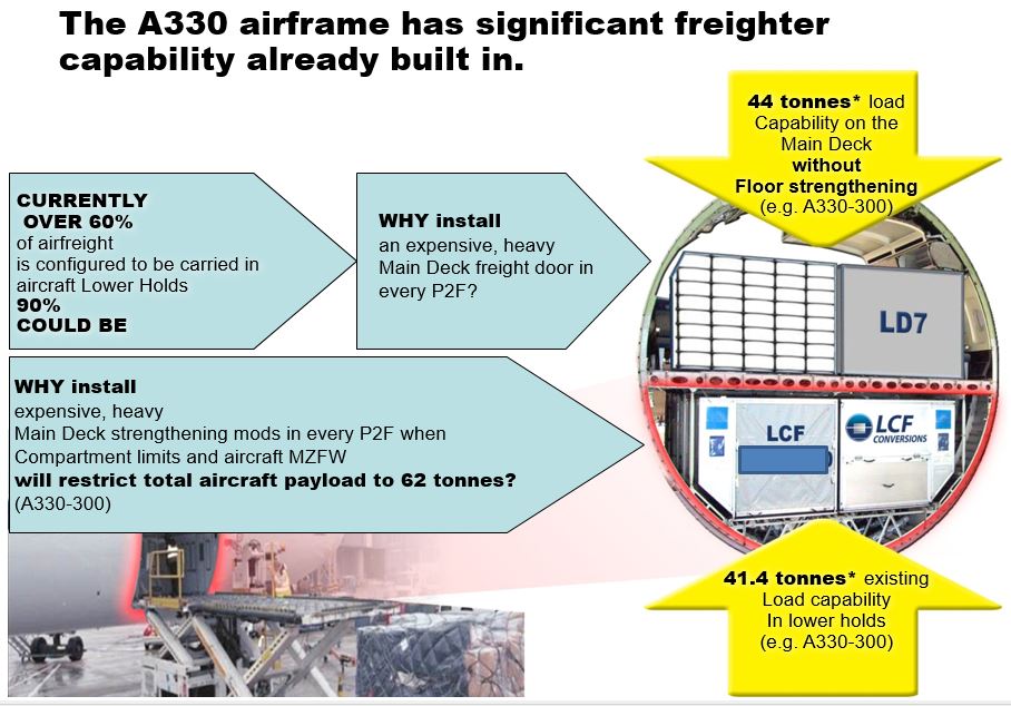 The LCF concept readily adapts the entire A330 family aircraft to offer freighter capability.